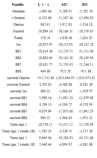 Para analizar la relación entre los rendimientos bursátiles y cambiarios mediante la metodología de las cópulas, se llevó a cabo un proceso de selección con base en los valores de los criterios de información de cada cópula estimada por el métodode máxima verosimilitud, así como por el valor alcanzado por el logaritmo de la función de verosimilitud. El cuadro 4 muestra que la cópula Joe de sobrevivencia (survival Joe) maximiza el valor de la función de verosimilitud, al mismo tiempo que minimiza los valores de los criterios de Akaike y de Schwarz.