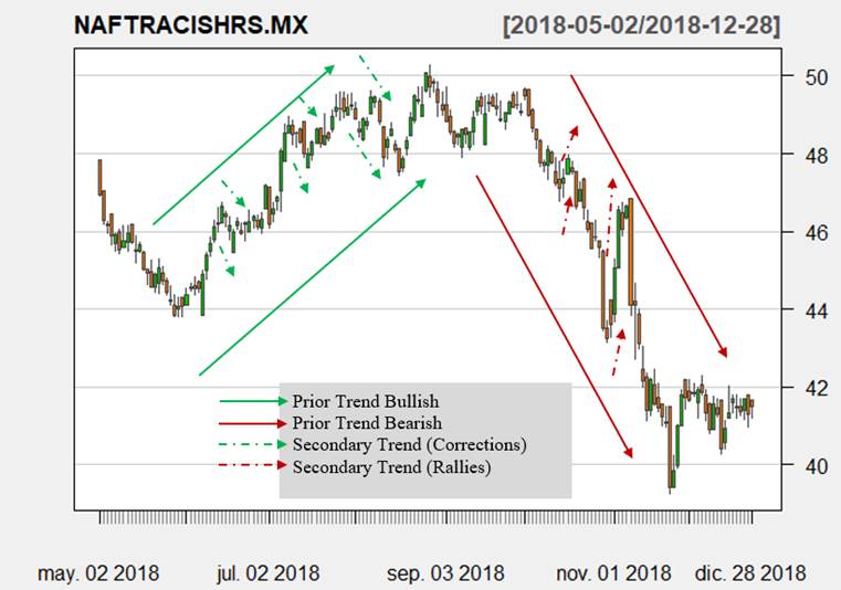 The cornerstone of the Dow Theory is that the stock market can be analyzed based on three kinds of trends: primary trend, secondary trend, and daily fluctuations. First, the prior trend is identified, although its duration and length are unpredictable, the Dow Theory and technical analysis as well make it more likely to anticipate a switch in trend. Secondary trend corrects prior tendencies; if the primary trend is bearish (downtrend), the secondary trend is called rallies. Otherwise, when the prior trendis bullish (uptrend), the secondary trend is named as corrections. Finally, daily fluctuations focus on closing averages, and they are useful for determinate long or short positions for traders. Figure 1 shows an example of a trend Theory by Charles Dow whit NAFTRAC.