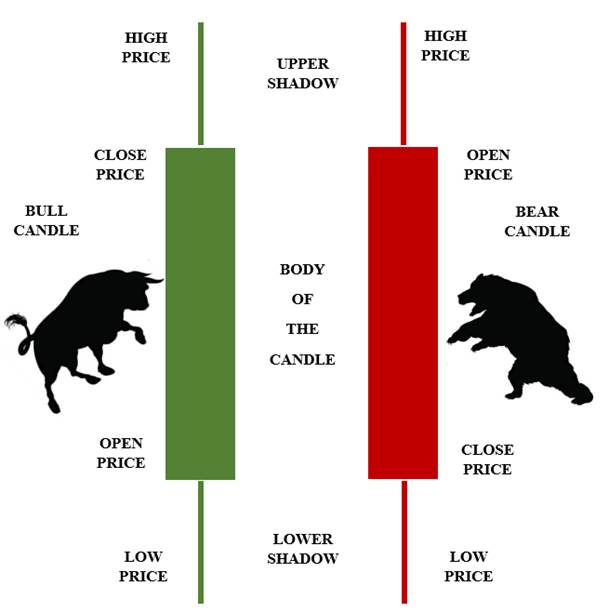 Technical analysis focuses on pattern formation trough Japanese candlesticks and a universe of trading rules, which includes the use of indicators, oscillators, and even geometrical figures. Japanese candlesticks represent the open, high, low, and close (OHLC) prices of an asset. It should be noted that technical analysis is a short-term analysis and that the candlestick represents the synthesis of the prices mentioned above. As from the position of the prices, candlesticks can be bullish or bearish; high and low prices represent the tails or shadows of the body of the candle as can be seen in figure 2: