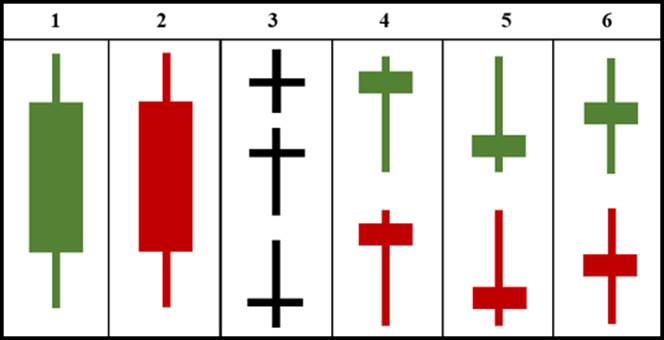From the combination of prices, different candles can be formed with both: bulls and bearers. Figure 3 shows a general classification of Japanese candlesticks that arose from the combination of those prices. The first candle (1) of figure 3 presents a biggreen body with small tails; it represents a confirmation signal of a bullish trend. The second candle (2) has the same meaning but for a downtrend. The candles numbered as 3 (short tails and bodies) suggest a hold position where neither buyers and sellers pressure the market. These candles are associated with uncertainty, and they are named as dojis12. Candles numbered 4, and 5 (long tails and small bodies) represent a trend reversal signal, both green candles are called as a hammer and inverted hammer respectively, and red candles are known as hanging man and shooting star. Finally, candles numbered as 6 (long tails and small bodies) indicate domain by buyers or sellers during the trading session. In the end, the open and close prices are relatively close, showing a sign of uncertainty in the market.
