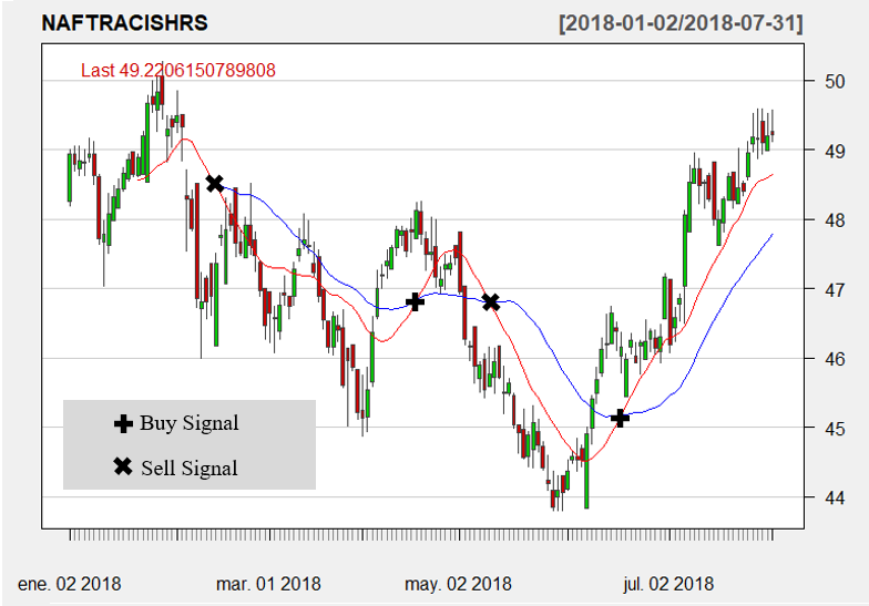 The way that is found a buy/sell signal is trough out the double crossover of SMA: this is when slow SMA crosses above or below a fast one. Figure 4 shows buy and sell signals trough moving averages crossovers. When the faster SMA, in this case, the 15 short average crosses below the slower SMA, this is, the 30-medium long average (the smoother), it is considered as a sell signal. Otherwise, when the faster SMA crosses above the SMA(30), then it is a buy signal. This is how SMA’s combinations become useful because, trough out its crossover, it is possible to find buy and sell signal in securities prices. However, one of the most certain challenges is to find combinations that help to detect signals in an accurately way; this is going to be possible in the Automated trading System proposed.
