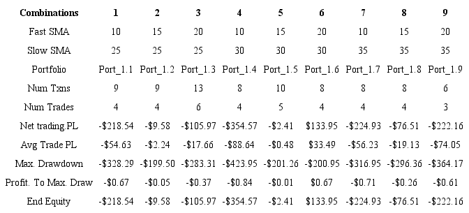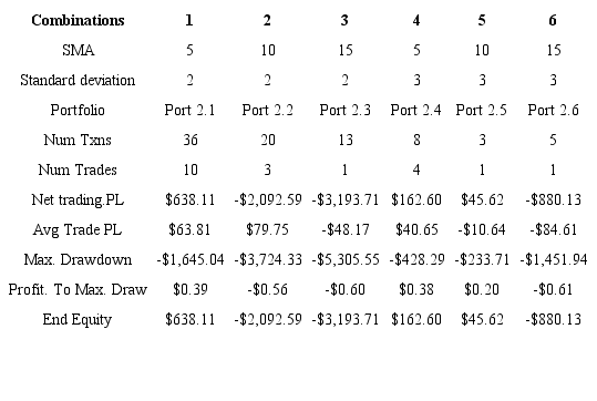 To select the best portfolio with SMA and BB combinations, we searched for parameters able to maximize historical risk-adjusted performance such as net trading, profit and loss, maximum drawdown, and profit to maximum drawdown. In the end, the best combinations were those its end equity exhibited the highest profit. Likewise, it is possible to know the number of trades and transactions of each combination as well as the average profit/loss per trade.