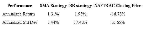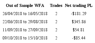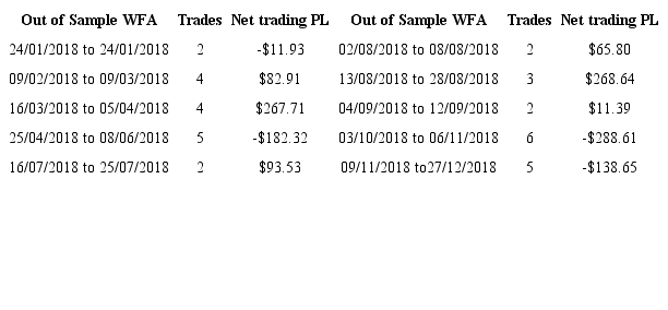 For SMA strategy, the first testing out of the sample is from 26/04/2018 to 16/05/2018 where the de net trading is -$181.29, while is true that the net trading is not a positive amount, the optimal in this case is to minimize losses (same situation 09/10/2018 to 15/10/2018). In the other hand, WFA from 22/06/2018 to 29/08/2018 and 11/09/2018 to 27/09/2018 shows a profit of $345.86 and $54.81 respectively: results out of the sample for SMA are in table 5.
