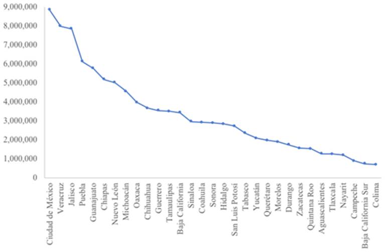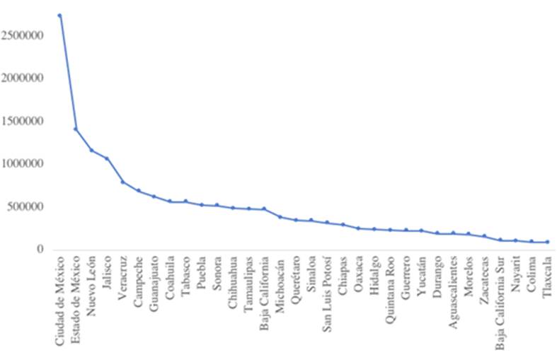 In what follows, figure two shows the distributional allocation of state gross domestic product for Mexico for year 2014, figure three the state distributions of regional heterogeneity of preferences for year 2014, and figure four the state population foryear 2014.