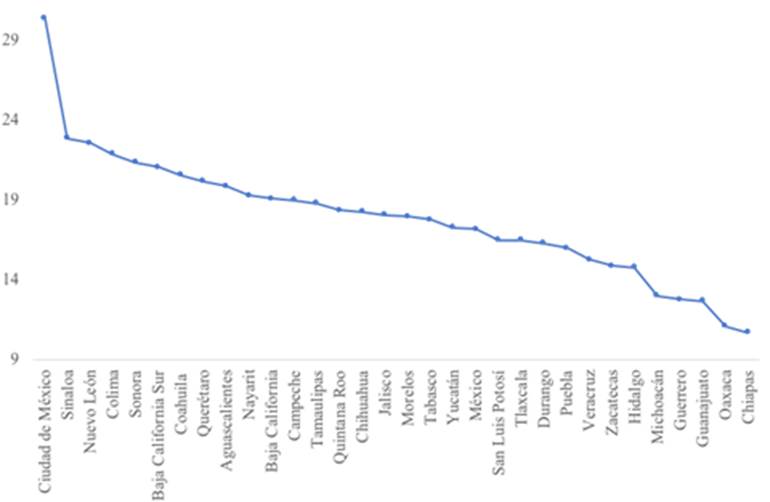 For the analysis of simulation, we use data for intergovernmental transfers, , as the sum of “participaciones” and “aportaciones” from the central government to state governments for year 2014, the state population in locality i for year 2014 (which is ), the real state gross domestic product of locality i for year 2014 (which in our model is ), and for the parameter of intensity of preferences we use the proportion of women with superior education for year 2014 (women with acollege degree). Empirical evidence shows that the characteristics of population in the locality matter to determine the demand of local public spending. In particular, the larger the proportion of women and the larger the education of residents the higher is the demand for public spending, see Ferris (1983), Bergstrom, Rubinfeld and Perry Shapiro (1982), Holsey and Borcherding (1997), among many others. Hence we use the proportion of women with a college degree in state i as a proxi of taste for goodsand services provided by the state government. The higher the proportion of women with college degree the higher the intensity of preferences for goods and services from the government and the higher the demand for subnational public spending. The sourceof our data is Instituto Nacional de Estadistica, Geografia e Informatica (INEGI).
