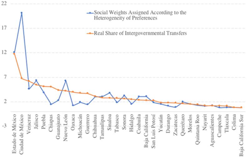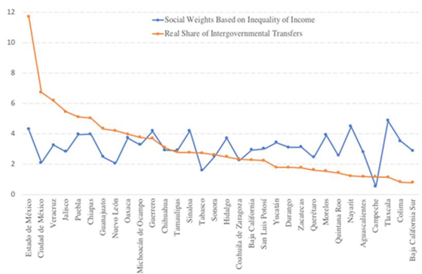 Our analysis provides interesting insights about the regional distribution of intergovernmental transfers in Mexico: the best fit of our model to observed data suggests that policy makers could use a social welfare function that satisfies the properties of anonymity and symmetry (all states receive the same social weight in the social welfare function). Our estimates also suggest that the best predictor of the share of intergovernmental transfers is the density of population in Mexico. This has the important implication that policy makers in Mexico do not fully incorporate the heterogeneity of preferences for goods and services provided by subnational governments and the regional inequality of income in the design of intergovernmental transfers.