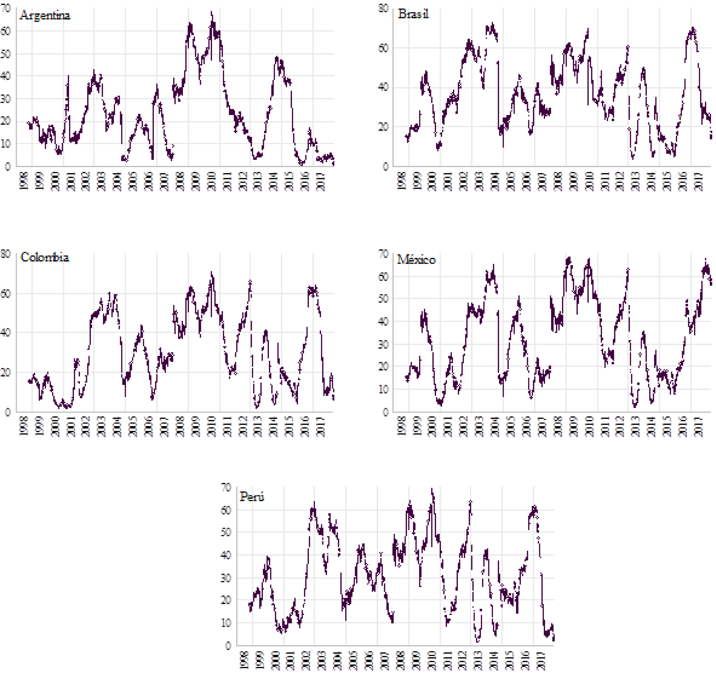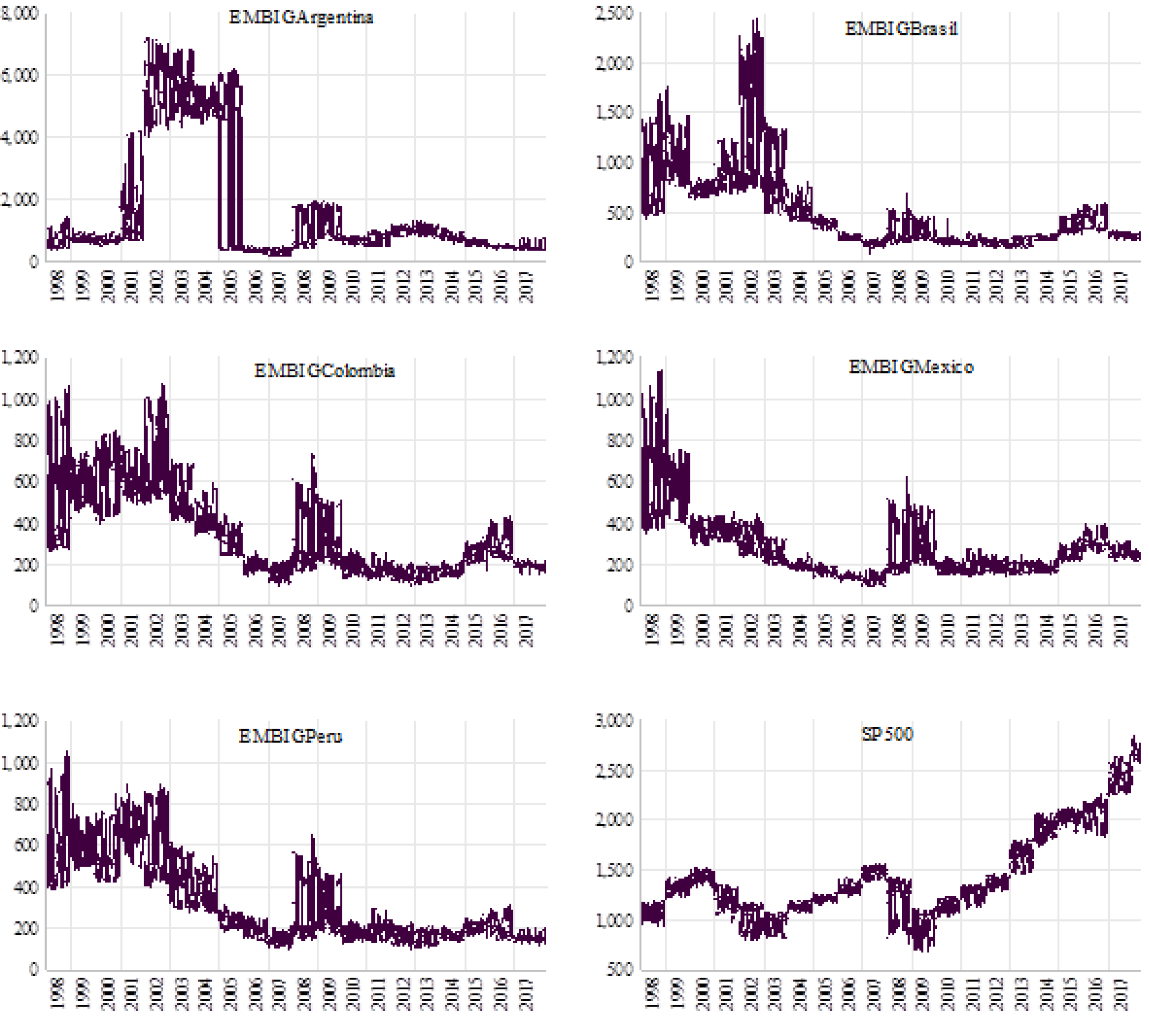 De las bases de datos de Bloomberg se obtuvo la información diaria de cierre de los índices EMBI Global para Argentina, Brasil, Colombia, México y Perú; las observaciones del S&P500 se obtuvieron de Yahoo Finance. Las series cubren el periodo entre el 31 de diciembre de 1997 y el 12 de abril de 2017, sumando en total 5,070 observaciones por país; en la figura 1 se puede ver su comportamiento. Destaca en el caso de Argentina de 2001 a 2005 por el elevado nivel de la serie, que lo lleva de una magnitud similar a la de los otros mercados a un alto crecimiento. También es de destacarse que en todos los países latinoamericanos se puede observar alzas en los niveles asociados con el periodo de la crisis financiera en Estados Unidos, reflejada como una severa caída en los valores del índice bursátil de ese país.