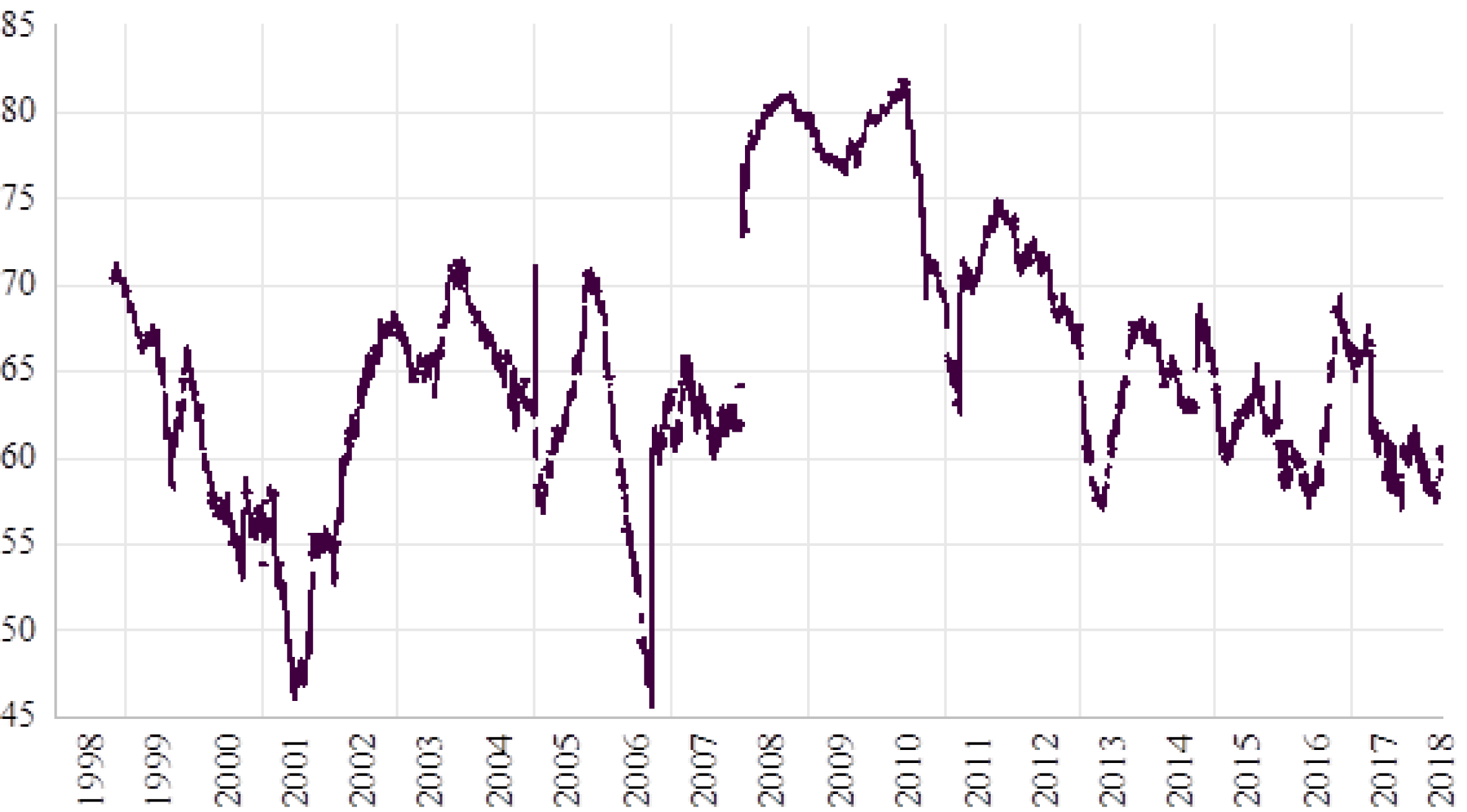 Como se observa en la figura 2, después de descender durante el periodo posterior a la crisis del mercado de deuda rusa en 1998 hasta 2001, el índice de spillover vuelve a ascender manteniéndose en un rango de variación entre un poco más de 55 y alrededor de 70. Durante 2006 observó un descenso notorio en ese índice, pero durante 2007 se ubica nuevamente en los niveles previos para continuar durante 2008 un ascenso notorio que lo lleva durante el periodo de 2008 y 2009 a los máximos de todo el periodo. Después de la efervescencia asociada con la crisis financiera mundial, se vuelve a ubicar en niveles medios alcanzados en los primeros años del siglo.