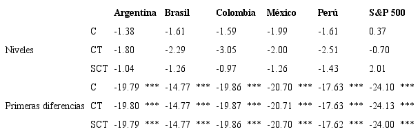 Las pruebas ADF de raíces unitarias (cuadro 1) muestran que ninguna de las series de los EMBIG ni el logaritmo del indicador bursátil estadounidense puede considerarse estacionaria, pero sus primeras diferencias sí.
