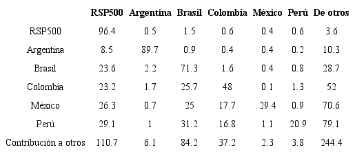 En el cuadro 2 se pueden observar la descomposición del índice de spillover en sus componentes direccionales. Se puede ver que un choque en el mercado bursátil estadounidense afecta en 96.4% al error de pronóstico a 10 semanas de sus rendimientos. Ese mismo choque puede afectar de manera notable al error de pronóstico de los cambios de los EMBIG de todos los países latinos, siendo el más fuerte efecto en el caso de Perú y al que menos afecta a Argentina. Después del mercado bursátil estadounidense, los choques en los cambios de Brasil son otra fuente importante de spillover afectando también de forma notable a los cambios en el EMBIG de Perú, país que es el más afectado por los demás en tanto que el mercado accionario de Estados Unidos es el que se ve menos afectado por los otros. El caso de México es digno de considerarse dado que, después de Perú, es el más afectado por otros, principalmente por Brasil y el S&P500. Los menos afectados son el mercado accionario de Estados Unidos y el EMBIG de Argentina, en ese orden.