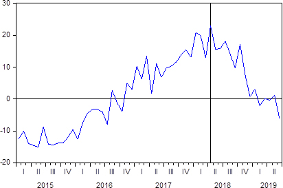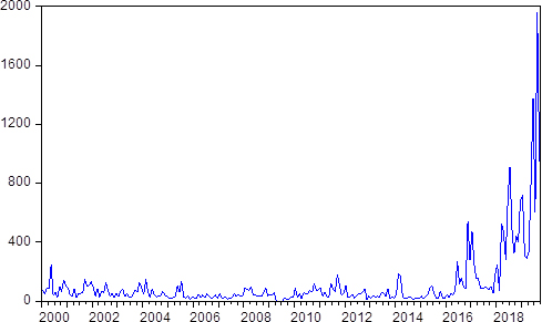 Es relevante mencionar que este índice de incertidumbre,3 que está disponible desde 1985.01, es una elaboración un tanto subjetiva de la política comercial de los Estados Unidos y cuantifica: a) la cobertura de 10 periódicos muy importantes de ese país4 sobre la incertidumbre económica relacionada con la política, b) la cantidad de disposiciones del código tributario federal de Estados Unidos de la Oficina de Presupuesto del Congreso que expirarán en años futuros y c) el desacuerdo existente en la encuesta de pronosticadores profe- sionales del Banco de la Reserva Federal de Filadelfia (Economic Policy Uncertanly, 2019). Sin embargo, aun cuando este índice tenga componentes subjetivos, constituye una importante narrativa que puede influir en el comportamiento de los agentes económicos. Tal es la tesis de Shiller (2019) que plantea que las noticias y las emociones ampliamente sentidas y compartidas por medios masivos pueden generar profecías autocumplidas.