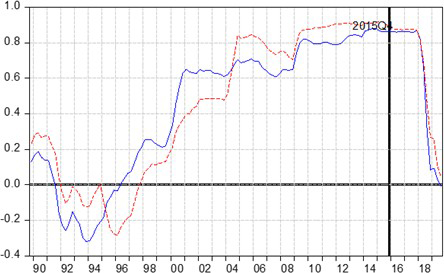 Este cálculo se realizó con submuestras que incorporan de manera sistemática una observación al final y eliminan una del inicio para mantener constante el tamaño muestral. El procedimiento continúa de manera progresiva hasta agotar el número de observaciones. Para ello es necesario determinar el tamaño de la submuestra estadísticamente adecuado. Fernández (1999) propone la siguiente regla: t0 = [τ0T]. Donde t0 es el tamaño de la submuestra óptimo para la estimación del coeficiente de correlación parcial. T es el tamaño total de la muestra y τ0 -el parámetro de trimming- es definido habitualmente en la literatura dentro del siguiente intervalo: τ0 ∈ (0,15, 0,85). Por lo tanto, a manera de ejemplo si tenemos 158 observaciones trimestrales y un parámetro τ0 = 0,17 tenemos una submuestra de 28 observaciones que equivale a 7 años. Este es el tamaño que aquí usamos.