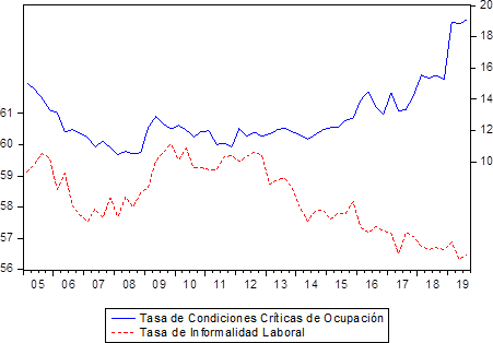 Los dos ejercicios se realizaron con la simulación dinámica y estocástica de Eudoxio: modelo macroecono-métrico de la economía mexicana (Loría, 2019a) para el horizonte 2020-2024, de los cuales se derivan tasas medias de crecimiento del PIB y del empleo muy reducidas, menores a la tasa media observada desde los años noventa. En ese sentido, el escenario inercial arroja tasas de 1.27 % y 1.59 % y el escenario pesimista de 0.64 % y 1.04 % respectivamente. Estos resultados tendrían también fuertes efectos sobre la calidad del empleo, como es el caso de la Tasa de Condiciones Críticas de Ocupación (TCCO), que harían que de una tasa actual del 20 % de la población ocupada, en el escenario inercial rebasaría el 30 % y en el pesimista llegaría al 40 % hacia 2024.