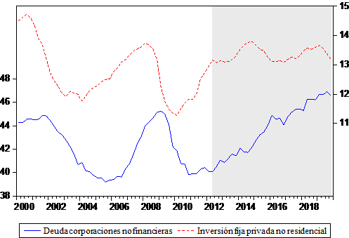 La gráfica Addendum 2 muestra otra cara de la misma moneda, pero quizás ahora aún más preocupante en la medida que a la vez que la inversión no residencial está estancada desde hace ya muchos años, el endeudamiento de empresas no financieras de ese país presenta niveles superiores a los de 2009.