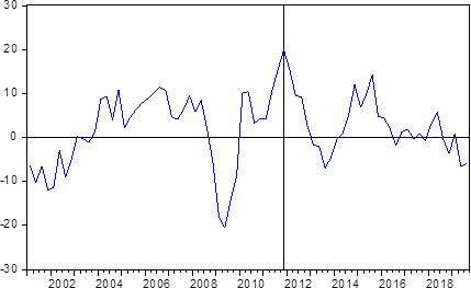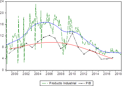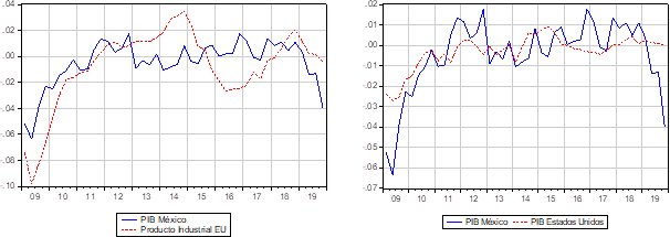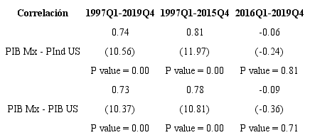 Por otro lado, resulta particularmente relevante la desincronización del ciclo de crecimiento de la economía mexicana con el ciclo de crecimiento estadounidense desde 2016 (cuadro 2) lo cual da cuenta de que al menos desde entonces han habido factores domésticos que han ido a contra corriente de lo que ocurre en esa economía. De manera pormenorizada el cuadro 2 deja ver que para el periodo 1997Q1-2015Q4 la sincronización fue alta (0.81 y 0.78 y estadísticamente significativa al 99 % tanto con el PIB como con el Producto Industrial de Estados Unidos, respectivamente). Contrariamente, en el periodo 2016Q1-2019Q4 observamos la pérdida de esta sincronización en la medida que la correlación ha dejado de ser estadísticamente significativa en ambos casos.