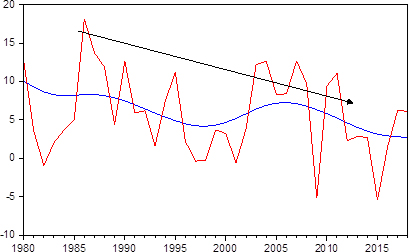 De acuerdo con Gordon (2015: 55), entre 1950-1972 en promedio el PIB creció 3.89 % y la productividad total factorial en 1.79 %, en contraste con 2004-2014 en que lo hicieron en 1.58 % y 0.54, respectivamente.