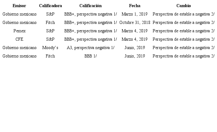 [13] Cervantes, A. (2019). El recorte de la calificación crediticia de México. https://www.eluniversal.com.mx/alejandro-cervantes-llamas/cartera/economia/el-recorte-de-la-calificacion-crediticia-de-mexico. Revisado 31 de octubre 2019.