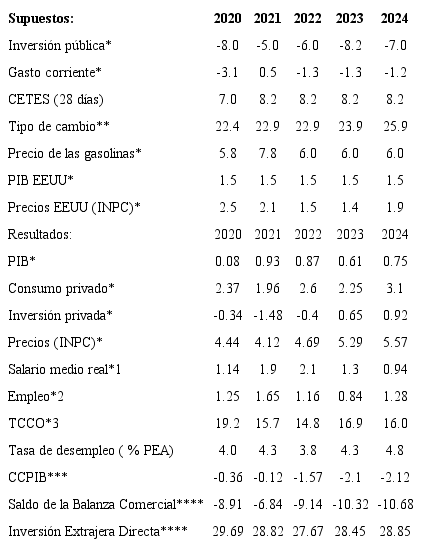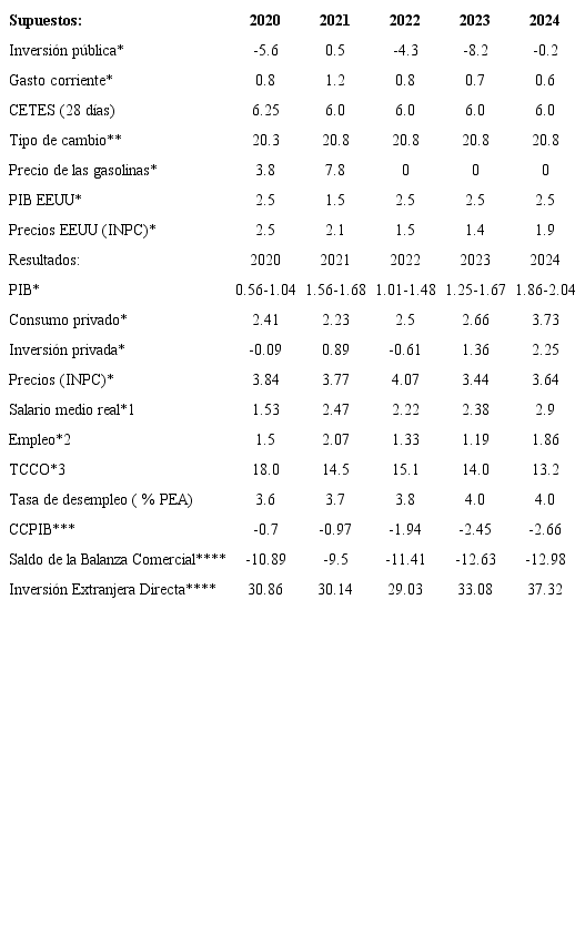 A poco más de un año de iniciado el gobierno actual es plausible considerar que ya se han definido con claridad las principales líneas personales y de política a seguir a través de decisiones, documentos oficiales y de pronunciamientos emitidos por el titular del ejecutivo y sus colaboradores. En ese sentido, -y siguiendo con la consideración de supuestos- es aceptable plantear que el gobierno evitará al máximo elevar en términos reales los precios de energéticos, por lo que continuará la contracción de la inversión pública con el afán de contener el déficit fiscal operacional (a partir de obtener un superávit primario sistemático) y la deuda pública en niveles que no afecten la calificación crediticia del país. Del mismo modo, suponemos que no se debilita notablemente el dinamismo de la actividad económica de Estados Unidos y que, aunque se ratifique y dé inicio el TMEC, en general se mantendrá la incertidumbre en los empresarios nacionales e internacionales, por lo que no habrá un repunte importante de la inversión privada nacional ni externa.