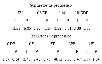 Los resultados en ambos casos son categóricos y pueden verse en los cuadros 4 y 5. En ambos casos la dinámica de la actividad económica presenta un fuerte estancamiento reportando tasas de crecimiento muy inferiores a las de los últimos 30 años, pero en el segundo escenario (P) el crecimiento es prácticamente nulo, además de que habría fuertes presiones inflacionarias que alterarían los equilibrios macroeconómicos fundamentales que se han mantenido en orden por muchos años.