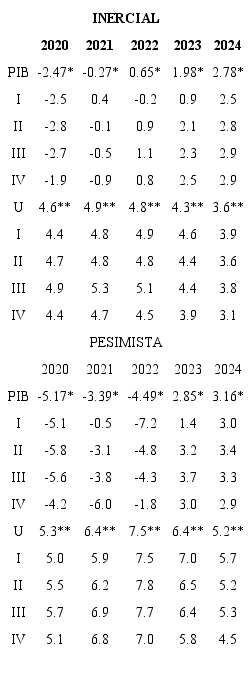 Este artículo presenta un ejercicio numérico resultado de la construcción de dos escenarios sobre la di- námica y tendencias de las principales variables macroeconómicas en México para el horizonte 2020-2024. El primero de ellos es el inercial (I) en cuanto a que considera como supuestos de partida que tanto las tendencias macroeconómicas de la presente década (principalmente la caída secular de la inversión pública), como las decisiones y la falta de congruencia que ha mostrado la actual administración federal (2018-2024) se mantendrán.
