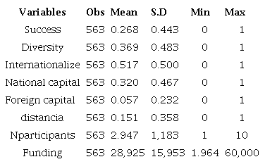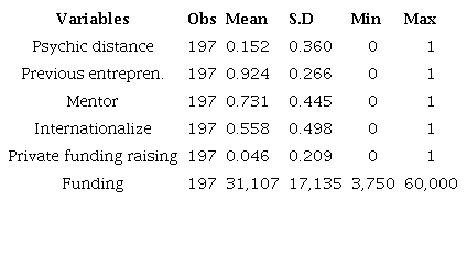 Due to the fact that this study aims to study companies that could be characterized as born globals, only companies that received financing between 2012 and 2017 were taken into account, which, by definition of the programs considered within the database, fall into the category of small and medium enterprises (SMEs). Consequently, and considering the variables chosen for both models, the database included 563 observations for the first model and 197 observations for the second model.