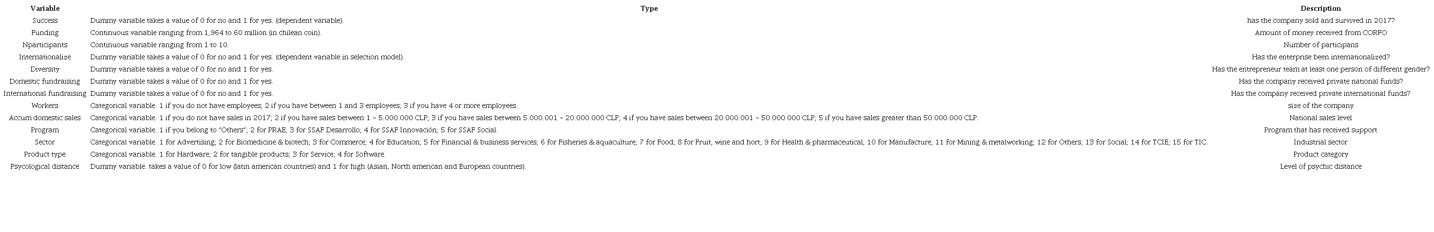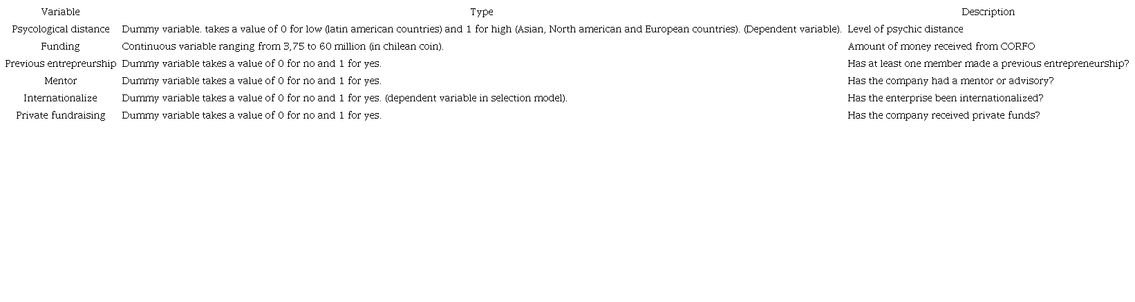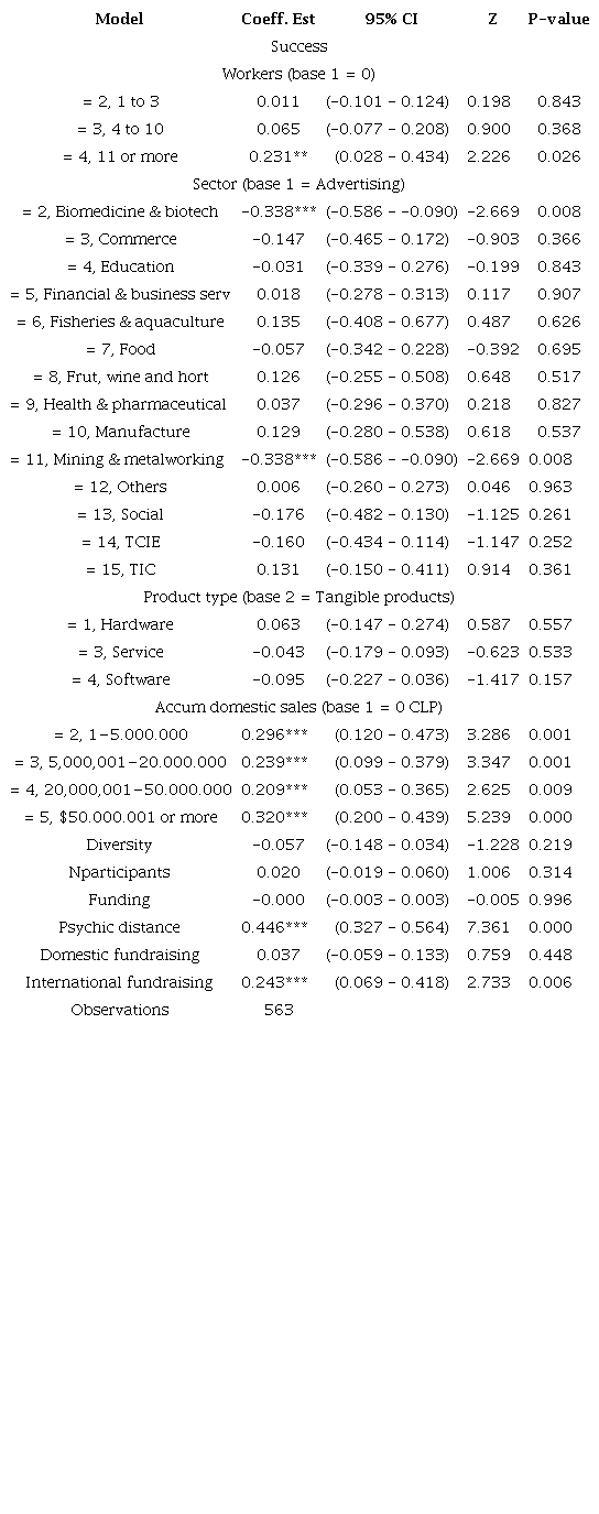 The first logistic regression model in two stages seeks to explain the success of enterprises benefited by a CORFO program in the international market. The dependent variable "Successïs a binary variable and is measured through the sales level and the company’s ability to survive. Therefore, the Success variable takes the value 1 if the venture effectively achieved sales in 2017 in the international market and in turn managed to survive. If any of the two previous conditions (or both) is not met, the variable takes the value 0. A similar approach is taken by Cancino, Núñez and Merigó (2018), where the authors define "Success” as dependent variable, which takes a value 1 if the company has survived and 0 in another case as well as they consider several industrial sectors in their study, finding some success differences between sectors. Meanwhile, the variable Funding is a continuous variable, which represents the amount of money received from CORFO (public funds). According Arping, Lóránth and Morrison (2010), public funds might have an uncertain effect, due to entrepreneurs may be less concerned to manage costs, but at the same time public support may encourage entrepreneurs to be creative. On the other hand, the variable Nparticipants was considered in the model because of entrepreneurial teams might have an important role in determining venture outcomes, as in the team members share perspectives, different approaches problem-solving, make decisions, among other benefits (de Mol, Khapova & Elfring, 2015). Internationalize is the dependent variable in the first and second selection model which aims to fix the self-selection bias. In addition, variables Domestic fundraising and International fundraising try to capture the existing relationship between private funds and entrepreneurial international success (Smolarski & Kut, 2011). Moreover, Workers and Accum domestic sales are variables related to company size. Thus, according their results, Ruzzier and Ruzzier (2015) claim internationalized small and medium enterprises are signifi-cantly larger in terms of sales and number of employees than noninternationalized companies. Another variable taken into account is Program, which is the selection variable in the first and second selection model. On the side of diversity variable, Zimmerman and Brouthers (2012) found a negative relationship between heterogeneous teams (diverse team) and international diversification decision, because of the possible conflict to make decisions. Additionally, Product type was considered as control variable as well. A similar control variable was used by Ellis (2011), where the author aimed to explain how the social ties between entrepreneurs might inhibit internationalization process. Finally, Psycological distance, the main interest variable, was considered to prove Hypotheses 1. This Variable has been tested in several academic studies, finding a tight relationship with internationalization process (Håkanson & Ambos, 2010; Ojala, 2015; Cancino, 2014; Hollender, Zapkau & Schwens, 2017; Magnani, Zucchella & Floriani, 2018; Bhowmick, 2019).