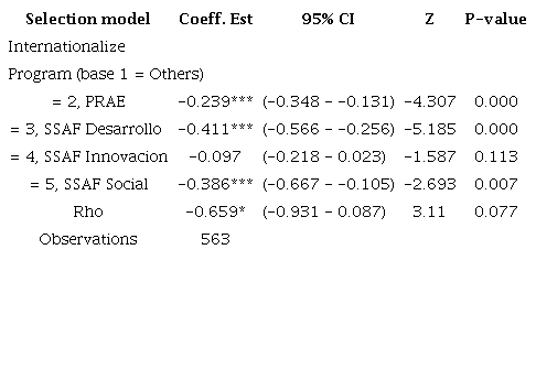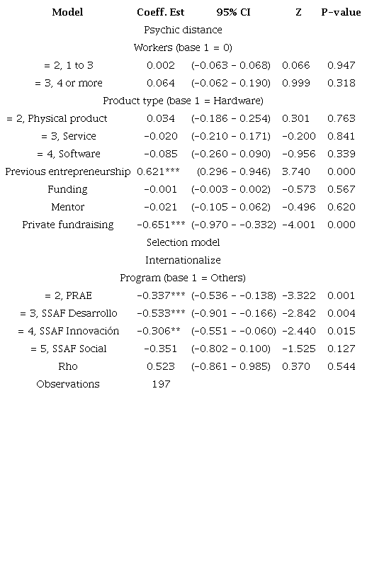 First of all, from the defined selection model, it can be observed that the coefficient of the Rho parameter was significant. This suggests that there is indeed a selection bias in the sample and that the estimators obtained from the model presented in Table 6 would be more reliable compared to those obtained using a one-stage estimation method. It can also be noted that the selection variable Program was significant for most of the categories. This leads us to understand that there would certainly be important differences in the probability of internationalizing depending on the type of program to which the enterprise belongs. In the case of SSAF Innovacion there would not be a significant difference, probably because the ventures of this program have a high degree of innovation as well as those of the category Others (Seed Capital and StartUp Chile).