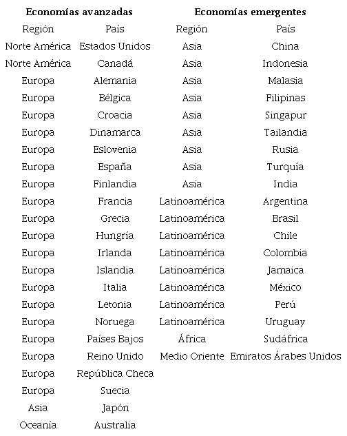 Podemos observar que dentro de la región asiática de la muestra sólo Japón es una economía clasificada como avanzada en contraste con la Europa en donde todos los países son considerados avanzados. Por último, cabe destacar que todos los países que se encuentran en las regiones de Latinoamérica, África y Oriente Medio están clasificados como emergentes.