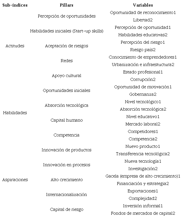 A partir de información de carácter individual e institucional, el GEI construye cinco niveles de información como: indicadores, variables, pilares, subíndices y el super-índice. Estos indicadores se obtuvieron del sitio Instituto de Desarrollo y Emprendimiento Global que proporciona el GEI3. Los indicadores son el nivel de medición más simple o básico que puede ser del tipo individual o institucional. Estos indicadores pueden provenir de encuestas o de fuentes secundarias. Por otra parte, en la Tabla 2 se presentan las variables que surgen a partir de un conjunto de indicadores. Asimismo, el GEI contempla 14 pilares que se definen para una mejor comprensión (véase Tabla 2) y menciona que éstos son los más importantes constituyentes del súper-índice GEI (Ács, et al., 2019).