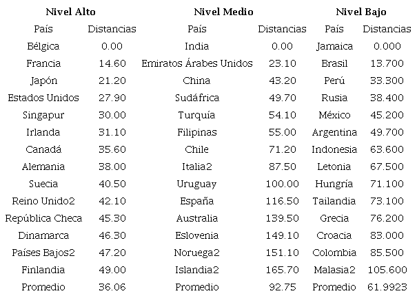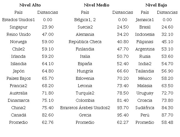 En relación con el ecosistema financiero para el emprendimiento en la Tabla 3 se presentan los tres niveles obtenidos en el 2006 y en la Tabla 4 los niveles en el 2018. Estados Unidos permanece como líder y país focal y en las tablas se observan que las distancias promedias en este nivel aumentan de 41.57 a 62.76. Además, países como Bélgica, Suecia y Emiratos Árabes Unidos, salen del nivel alto y entran Chile, China y Francia (véase Tabla 4). Estos hallazgos son consistentes con Voelker (2012) que menciona que los países desarrollados tienen fortalezas en la infraestructura financiera por lo que se mantienen. Por otra parte, Herrintong (2017) menciona importantes políticas financieras en países Chile y China, creando fondos en inversiones de capital en empresas estratégicas en ambos países.