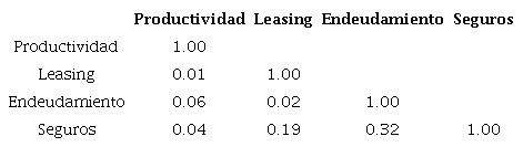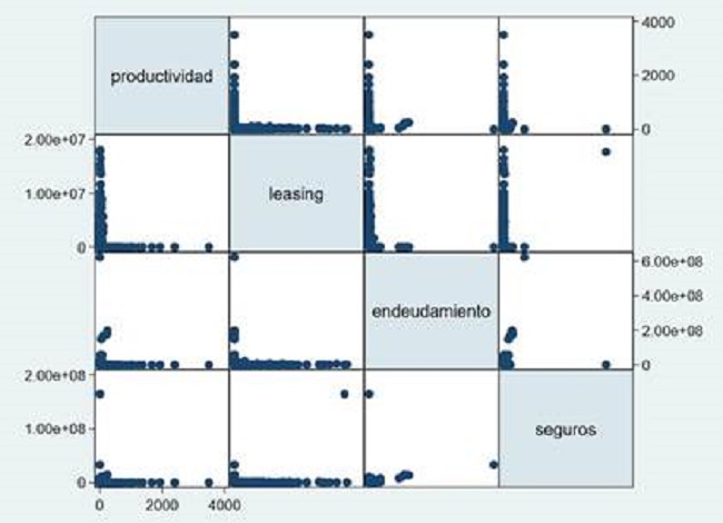 A pesar de que la forma logarítmica mejora sustancialmente las correlaciones mostradas, la alta incidencia de valores cero en las variables de endeudamiento y leasing hace que con esta transformación se pierda una parte importante de las observaciones.