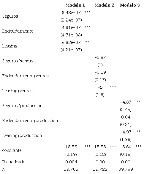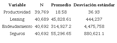 La tabla 1 resume las estadísticas descriptivas para las variables relevantes dentro de los modelos propuestos. Inicialmente, se observa que no hay una incidencia relevante de valores faltantes y que todas las variables propuestas reflejan la heterogeneidad de los establecimientos industriales. Esto se puede apreciar en los valores especialmente altos que se obtienen para la desviación estándar en comparación con los promedios. Una cuestión problemática encontrada en la exploración inicial de los datos es la alta incidencia de valores iguales a cero. Para las variables de seguros y productividad, la existencia de ceros no es un problema; pero, de acuerdo con los datos utilizados, para 10.706 establecimientos el total de los intereses causados sobre los préstamos es igual a cero. Lo mismo ocurre en 37.937 establecimientos para la variable valor total del leasing.
