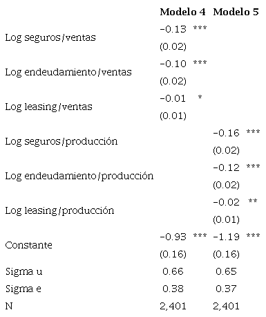 De esta forma se calculan nuevos ajustes que incluyen las formas logarítmicas sugeridas por el análisis exploratorio. Como se mencionó previamente, el número de observaciones se reduce en una amplia magnitud debido a la incidencia de valores cero en algunas de las variables. Además de modificar la forma funcional, se utilizan métodos de datos panel, después de que la regresión de efectos fijos fue validada a través del test de Hausman. Con este ajuste, la relación entre las variables de inclusión financiera y la productividad es inversa, de manera consistente en ambos modelos (tabla 4).