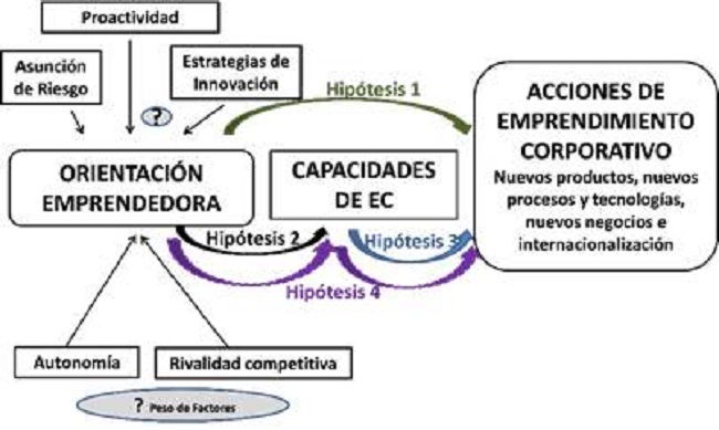 Es de esperarse, acorde a las teorías de la estrategia, que una empresa que pretende impulsar la conducta emprendedora e implementar acciones de EC, debe ajustar sus capacidades para alcanzar los objetivos estratégicos y ventajas competitivas, lo que sintetiza como la OE de una empresa como voluntad y actitud, se concreta en acciones emprendedoras, complementándose entre si ambos fenómenos: Se considera que una empresa con alta Orientación emprendedora, cuando se caracteriza por la proactividad, asunción de riesgos y carácter innovador, reúne atributos por parte de sus directivos y talento humano, como la intención y la persistente voluntad de emprender, el permanecer alertas a oportunidades del entorno, analizarlas en función de su viabilidad, elegir entre múltiples opciones de inversión, asignar recursos y realizar constantemente acciones de Emprendimiento corporativo.