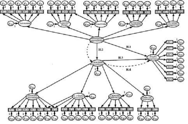 Las relaciones entre OE y las capacidades que se desarrollan para gestionar los procesos de emprendimiento de manera más efectiva, y que interactúan como determinantes del EC, se plasman en el modelo teórico estructural que se observa en la Figura 2: