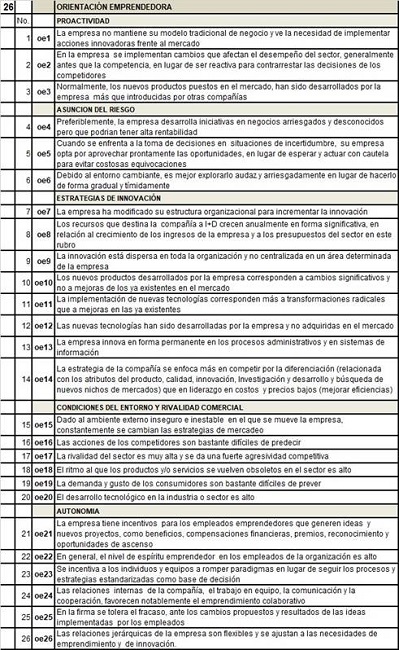El cuestionario se estructura con respuestas a las preguntas en escala Likert; para encontrar las variables a analizar en el estudio, la encuesta se estructuró con 55 variables observables y que posteriormente integran las tres variables latentes, validadas en el análisis factorial: OE, que comprende 26 preguntas; las capacidades, denominadas Recursos y Capacidades -RECCAP, que incluye 22 preguntas; por último, las acciones de emprendimiento en que se concreta el EC, con 7 preguntas.
