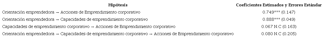 Hipótesis 4: La incidencia positiva entre orientación emprendedora y las acciones de emprendimiento corporativo de las PYME, se modifica cuando es intermediada por las capacidades de emprendimiento corporativo.