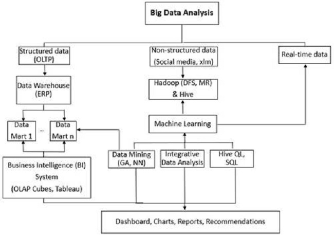 In order to process non-structured data we can also use Data Mining methods, but in a Machine Learning framework. Machine Learning is a sub-area of artificial intelligence that aims to find patterns by using algorithms such as Genetic Algorithms (GA) and Neural Networks (NN) that replicate the way human beings learn by trial and error. GA are excellent for searching in a complex database and find optimal solutions through a process inspired in selection, mutation and recombination from natural biology. A NN tries to find patterns in huge amounts of data using different layers replicating the human brain. In other words, we train the algorithm with a subset of the data and then we adjust the predictions with the remaining part of the data. Besides we can also use Hive SQ programing and integrative data analysis techniques in order to find patterns in the data with SQL well known commands and with a mixture of data such as videos, blogs, and so forth.