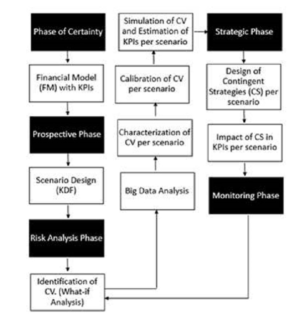 We contribute to the current literature by designing a methodology that involves consists of five (5) stages: financial modeling, prospective analysis, risk analysis that includes BDA, strategic analysis and monitoring. Furthermore, the proposed methodology is comprehensive since it allows the inclusion of various areas of the company in order to improve its financial performance represented by the KPIs and the analysis can be performed for specific areas, business units and for the whole company.