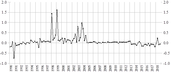 En la Figura 1 se observa que el SCUN promedio, considerando las 84 empresas estudiadas, fue predominantemente negativo de 1990 a 1995, lo que sugiere pérdidas cambiarias importantes para muchas empresas y que en la parte final de ese periodo puede explicarse como resultado de que la crisis de 1995, como señalan Watkins, Spronk y Félix (2005), aumentó el valor en dólares de la deuda que empresas mexicanas contrataron en esa moneda. Las fugas de capital atribuibles a las tensiones políticas durante 1994 y el crecimiento del déficit de cuenta corriente, a razón de un punto porcentual anual en promedio de 1989 a1994, fueron presiones cambiarias muy importantes. Entre fines de 1997 y principios de 1999 se observan alzas bruscas, seguidas por varios años de relativa calma, hasta que entre 2002 y 2004 se observan nuevamente altibajos notables, indicando que las empresas estudiadas obtuvieron ganancias cambiarias, pese a la crisis asiática de 1997. Es conveniente destacar que, según el INEGI, el PIB mexicano del tercer trimestre de 1994 alcanzó los 520 mil millones de dólares y descendió a 287 mil millones de dólares en el primer trimestre de 1995, es decir, se contrajo 44%, y logró recuperarse hasta el primer trimestre de 1999 cuando ascendió a 547 mil millones de dólares. Entre 2005 y 2013 el SCUN muestra bastante estabilidad, sin embargo, después regresó a un nivel de valores negativos.