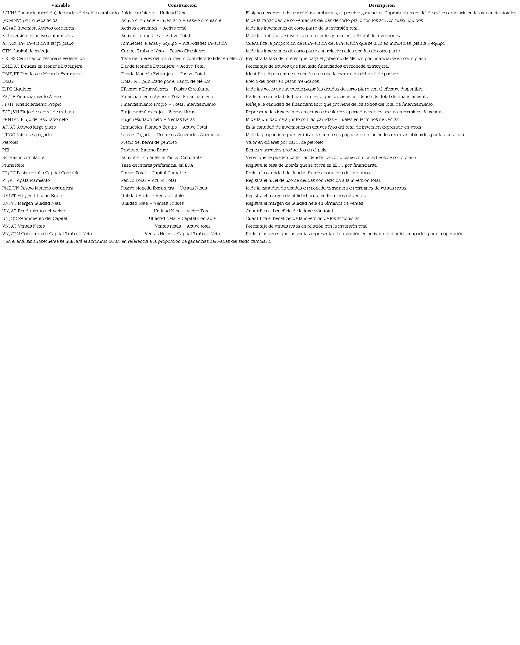 El análisis que se presenta en la sección posterior se llevó a cabo para determinar qué variables internas de la empresa y macroeconómicas explican el saldo cambiario, el cual refleja las ganancias (con signo positivo) y pérdidas cambiarias (con signo negativo) provenientes de la tenencia de pasivos y activos en moneda extranjera y de ingresos y egresos en moneda extranjera. La norma contable señala que a la fecha de cierre de los estados financieros presentan saldos de partidas monetarias (cuentas por cobrar y cuentas por pagar) derivadas de transacciones en moneda extranjera y que estén denominadas en moneda extranjera deben convertirse al tipo de cambio con el que pudiera haberse realizado (cobrado o pagado). De estos procedimientos surge diferencias en cambios que deben reconocerse como ingreso o gasto en la utilidad o pérdida neta del estado de resultados integral en el período que se origina. Las NIF señalan que para determinar la utilidad o pérdida cambiaría debe utilizarse el tipo de cambio con el que pudiera haberse realizado (cobrado o pagado). En México se utiliza el tipo de cambio establecido por el Banco de México, denominado dólar fix, que se publica en el Diario Oficial de la Federación.