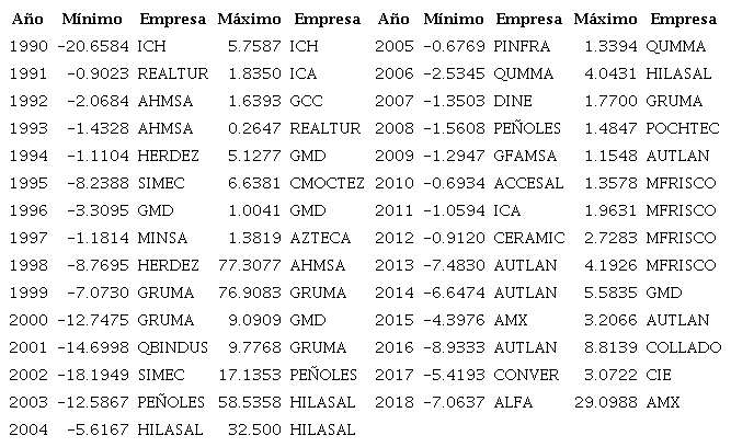 En el Cuadro 2 se observa que para cada año las empresas que reportaron SCUN negativos y positivos pertenecen a diferentes sectores. Durante la década de 1990 las empresas con SCUN más altos fueron predominantemente de los sectores de la construcción e industrial; para el período de 2000 a 2010 del sector minero y del de telecomunicaciones. Los sectores que reportaron SCUN más negativos durante la década de 1990 fueron las empresas de los sectores industrial, materiales y consumo frecuente. En el sector industrial se encontró que GMD en el primer trimestre de 1996 tuvo el SCUN más alto y en el siguiente trimestre el más bajo. Para el periodo de 2000 a 2010 fueron en su mayoría empresas del sector materiales, y en menor medida del de consumo no básico, industrial y telecomunicaciones; entre 2010 y 2018 del industrial y telecomunicaciones. Además, se observa que los SCUN máximos y mínimos se presentaron durante el período de 1998 a 2004, siendo excepción AMX quien a fines de 2018 obtuvo un SCUN positivo comparable al de ese periodo, en tanto que ICH muestra a principios de 1990 el SCUN más desfavorable de todo el horizonte de estudio.