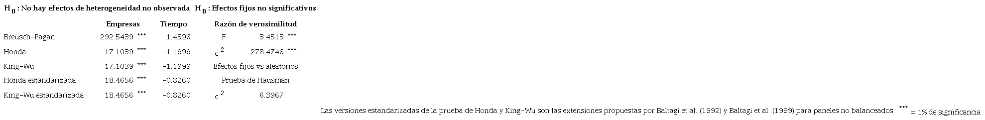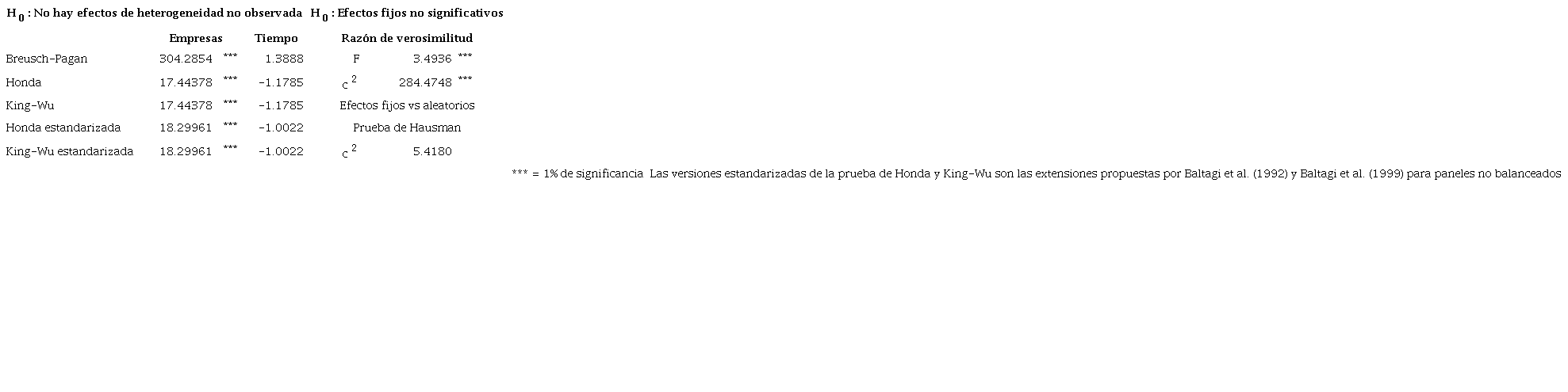En el Cuadro 4 se muestran las diversas pruebas de especificación, iniciando por las pruebas de existencia de efectos de heterogeneidad no observada, con base en sus resultados se puede deducir que el modelo adecuado debería incluir efectos individuales de la empresa, pero no efectos temporales no observados, destacando al respecto la coincidencia de las pruebas diseñadas específicamente para paneles no balanceados como es el caso del que se emplea en este análisis. La prueba de razón de verosimilitud sugiere que los efectos fijos estimados mediante mínimos cuadrados son significativos. Por su parte, la prueba de Hausman sugiere no rechazar la hipótesis nula de ausencia de correlación entre los efectos y los regresores, por lo que tanto las estimaciones de efectos aleatorios como de efectos fijos son consistentes, sin embargo, bajo esa hipótesis nula los parámetros del modelo de efectos fijos son ineficientes (tienen mayor varianza), razón por la cual sería preferible considerar los efectos individuales de las empresas como aleatorios.