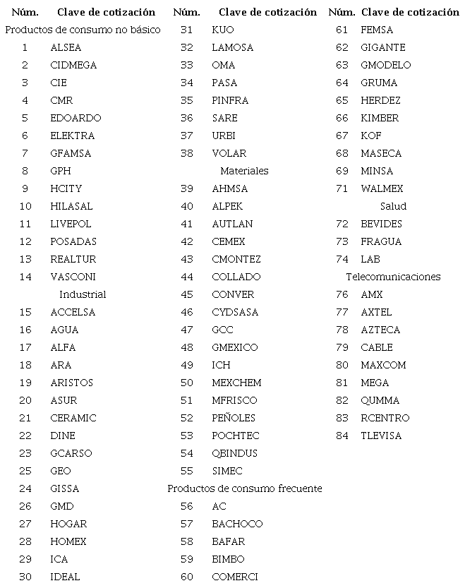 De Economatica y de la Bolsa Mexicana de Valores se obtuvieron, en dólares, el balance general y el estado de resultados de las 84 empresas estudiadas: 14 del sector productos de consumo no básico, 24 del sector industrial, 17 del sector materiales, 16 del sector de consumo frecuente, 4 del sector salud y 9 del sector telecomunicaciones, véase anexo 1.1 Del INEGI se obtuvo el Producto Interno Bruto (PIB) y del Banco de México el precio del dólar y el precio de la mezcla mexicana de petróleo. Todos los datos son trimestrales, pero no todas las empresas estudiadas cotizaron durante todo el periodo así que el número de observaciones difiere, las más amplias cubren del primer trimestre de 1990 al cuarto de 2018.