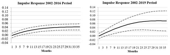 The left-hand graph in figure 1 shows the pass-through elasticity from 2002 to 2016. Those years exclude the 2017-2019 period when gasoline prices increased rapidly. The elasticity value is 0.04% after 36 months. Confidence intervals in figure 1 (in dotted lines) show that zero is excluded, thereby indicating that they are relevant and statistically different from zero.