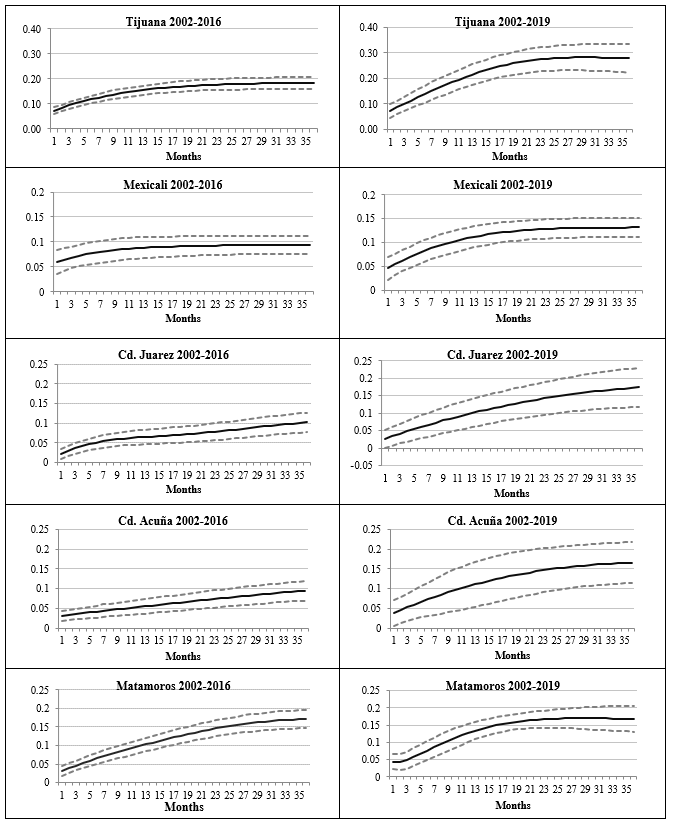 This section shows the impulse response functions after developing the VAR model for each of the analyzed border and non-border cities. To see how variations in the exchange rate affect consumer prices, a 1% depreciation in the exchange rate is simulated. Results are presented in elasticities and show the accumulated pass-through effect from variations in the exchange rate to the inflation rate. The elasticity in period ɛ is calculated as follows: