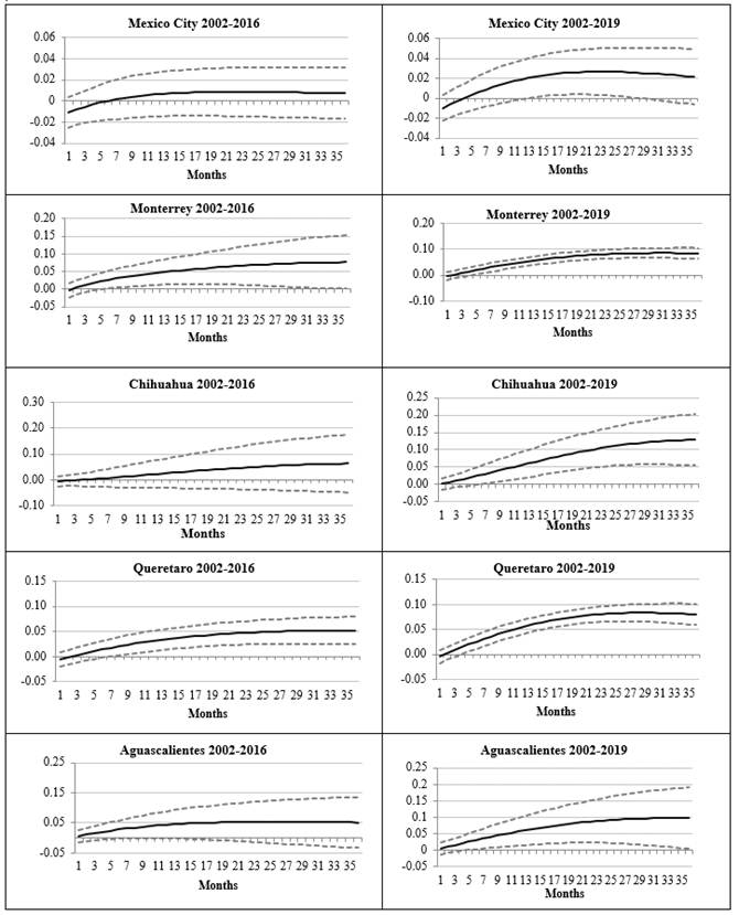 When the 2017-19 period is excluded from the analysis, the pass-through estimates for the non-border metropolitan cities become weaker. This is different in comparison with the full sample, where 20 of the 27 cities show a significant relationship. In this case (sub-sample) 7 cities are found to be statistically significant. The impulse response functions are statistically significant only for Colima, Culiacan, Morelia, Monterrey, Queretaro, Torreon, and Merida, where the pass-through values are between 0.03 and 0.08%. Only Culiacan shows a high pass through (0.21%). This value indicates that even if the Mexican peso had depreciated during a portion of the analyzed period, prices would have barely changed in non-border cities. Nevertheless, when gasoline prices increased surprisingly in January 2017 and prices were adjusted to international levels, taxes, etc., producers transferred a portion of the shock, which put pressure on the inflation rate.