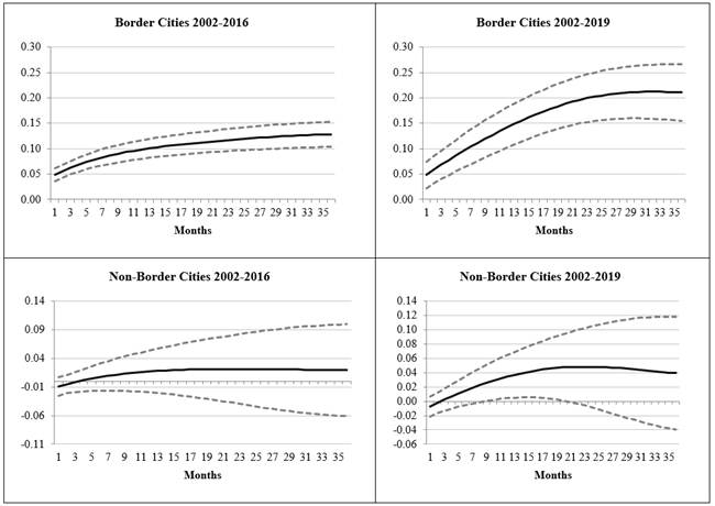 Figure 4 shows overall estimates for the border and non-border areas during the 2002-2016 and 2002-2019 periods. During the 2002-2016 period (before gasoline shock prices), the exchange rate does not have a statistically significant effect on prices in the case of non-border cities, but when the entire period is included (2002-2019) the effect becomes statistically significant and is close to 0.04%, but does not show significance after the 20th month. In the case of border cities, the effect is statistically significant in both periods, 0-13% for 2002-2016 and above 0.20% for the whole sample (2002-2019) after 36 months.