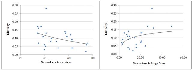Figure 5 shows a scatter plot for results of the 2002-2019 sample. The y-axis labels for both graphs shows the elasticities for all cities with statistically significant values. The x-axis on the left-hand graph labels the % of workers in the service sector and the right-hand graph labels the % employees of total employees working in large firms. The left-hand graph shows a negative relationship between pass-through values and the percentage of employees in the service sector. The trend line for such scatter plot indicates that an increase in the percentage of employees in the service sector reduces the pass-through elasticities. The right-hand graph shows a positive relationship between the pass-through values and the % employees of total employees in the city working in large firms. The trend line for this graph shows that when more people in a city are working in large firms then the pass-through value increases.