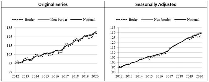 Figure A.1 includes on the left-hand side non-seasonally adjusted values for the border and the non-border regions. Such values include seasonal Christmas and summer effects, a period when the government traditionally provides a subsidy to consumers due to a seasonal increase in energy prices. On the right-hand side, the graph includes seasonally adjusted values which show less variability once the seasonal effects are eliminated. The estimations in this study include only seasonally adjusted series.